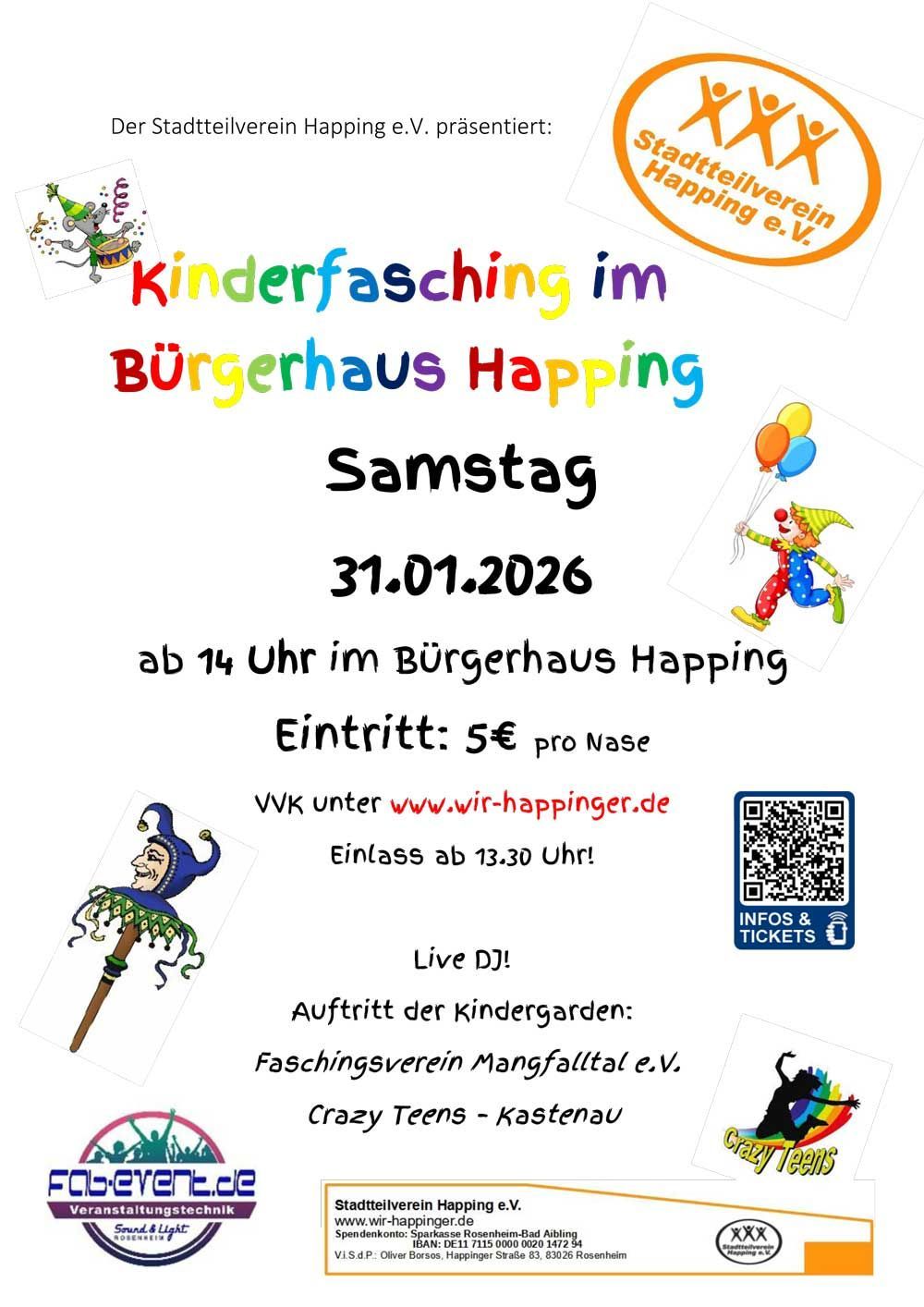 Das Bürgerhaus verwandelte sich zum Tollhaus! Auch dieses Jahr war das Bürgerhaus, einen Nachmittag lang, ganz in Kinderhand! Rund 250 kleine Narren feierten, tanzten, lachten und staunten beim närrischen Vergnügen beim Happinger Kinderfasching 2026! Für Stimmung sorgt DJ MuTz und als Highlight kammen die Kindergarden des Faschingsverein Mangfalltal, aus Kolbermoor und die Crazy Teens aus der Kastenau.