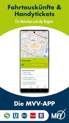 Die MVV-App ist die kostenlose Fahrplanauskunfts- und Handyticket-App des MVV für unterwegs. Wie die MVV-Auskunft im Internet bietet die MVV-App schnell und zuverlässig Fahrplanauskünfte, Handytickets sowie weiterführende Funktionen und Informationen für Ihre Fahrt mit dem ÖPNV – in vielen Fällen in Echtzeit – und ergänzenden Mobilitätsangeboten (z.B. Bikesharing, Carsharing, Scootersharing). Die MVV-App ist Ihr Begleiter für einfache Mobilität im gesamten MVV-Verbundgebiet.